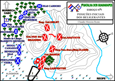 Ocuparam posições, ao que parece, camuflados nos pântanos situados a SE dos Guararapes e matas abertas situadas ao S e SO de ditos montes.