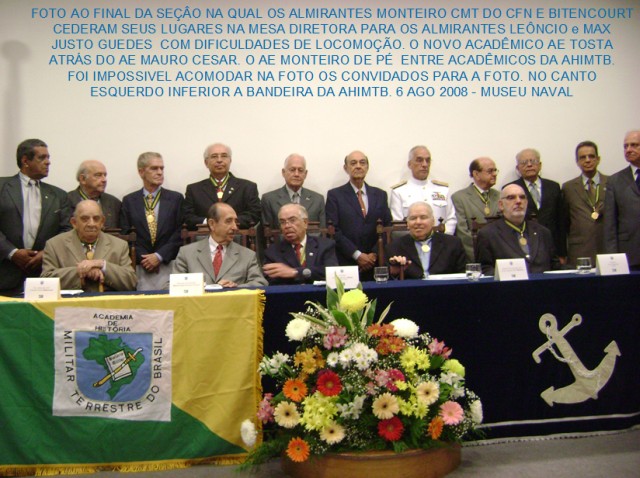 ( O texto acima sintetiza os pronunciamentos do Presidente de Honra da Seção AE Mauro César. Do Presidente da AHIMTB Cel Bento em suas Palavras Finais , do AE FN Monteiro comandante do CFN. Do AE Bittencourt ,Diretor da DPHDM ,dos acadêmicos empossados AE FN Tosta e CA Max Justo Guedes e dos que os receberam em nome da AHIMTB ,CA Hélio Leôncio Martins, patrono em vida de cadeira AHIMTB e do acadêmico Cel Roberto Mascarenhas de Morais e complementos deste Delegado que condensou este texto.