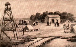 - Caxias - QG em Para Cuê, reconstituído por Miranda Jr. com apoio em foto em mau estado. A esquerda, uma torre chamada mangrulho, um posto de observação da enorme planície em torno, uma característica do Teatro da Guerra do Paraguai nas planícies marginais aos rios. (Fonte: EME. História do Exército Brasileiro, v. 2) |
