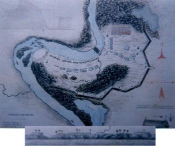 Fortaleza de Humaitá e suas imediações, mapa mandado levantar pelo Alte e Barão de Inhauma José Joaquim Ignácio. Este era o objetivo militar dos aliados. Veja-se a posição dos navios da Esquadra. Com os números: 11, as correntes que barravam o rio e o 1, a fortaleza com suas inúmeras baterias, sendo a 7, a bateria Londres. O 8 quartéis de Artilharia, os 18 e 26 quartéis de Infantaria, 17 igreja, 20 Casa de Solano Lopes, 27 Quadro de mulheres e 30 trincheiras com fosso de terra com 10 palmos de largura e 10 de altura. (Fonte: IHGB - 150 anos. P. 193) |