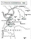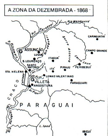 A Zona de Combate da manobra de Flanco de Piquiciri através do Chaco e da Dezembrada, vendo-se assinalada entre Angostura e Sta Helena, o traçado da estrada construída por Caxias sobre o Chaco e os locais de suas vitórias na Dezembrada( - Itororó. Avai e Lomas Valentina). (Fonte: PORTELA cel. Mallet - patrono da Artilharia). |