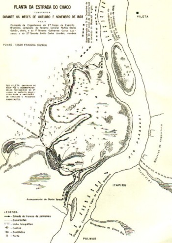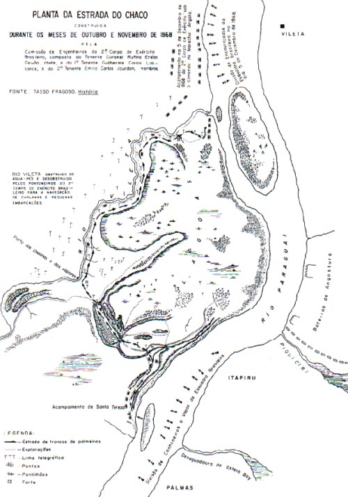 A estrada do Chaco em out-dez 1868, balizada por setas pretas, acompanhando, acima, o corte do arroio Vileta e ao longo dela uma linha telegráfica e 4 pontilhões construídos pelo Batalhão de Pontoneiros criado no Rio Grande do Sul e extinto antes da Campanha da Cordilheira. (Fonte: EME História do Exército Brasileiro, com apoio em Tasso Fragoso) |