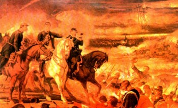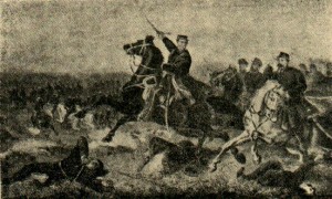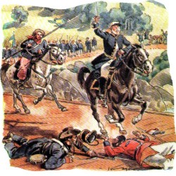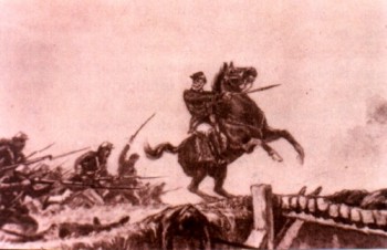 Caxias na conquista de Itororó, o seu maior momento como líder de combate, em alegoria de Miranda Júnior. (Fonte: EME - História do Exército) |