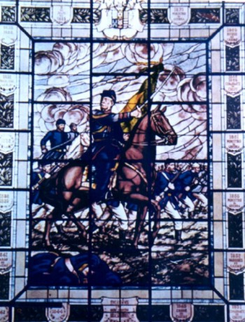 Caxias na conquista de Itororó, em vitraux no Palácio Duque de Caxias, com apoio em desenho de Miranda Júnior, vencedor em concurso sobre o tema para decorar o palácio a ser construído. (Fonte: CARVALHO, Afonso de. Caxias. BIBLIEX, última ed.) |