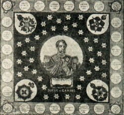 - Lenço comemorativo das vitórias de Caxias, amplamente adquirido por veteranos da Guerra do Paraguai, depois do término dela. As estrelas representam suas vitórias militares. No quadrado ,com as estrelas ,as suas insígnias das ordens da Rosa, de Avis, de Cristo e de D. Pedro I. (Fonte: Revista Militar Brasileira ago 1935) |